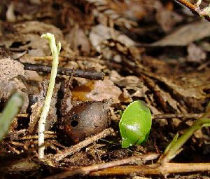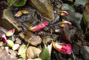 お次に行ったのは沢沿い 沢へ降りた地点は ちょうどヤブツバキの真下あたり・・・ おお,花が落ちている落ちてるー! でも ![]() 何で半分なの〜? どこかにちゃんと片割れも転がってる 「貝あわせ」ならぬ「花あわせ」でもして遊べそう 犯人はヒヨドリ? でもこんな食べ方するかな?? ムササビだったらいいのになぁ・・・ ところで ツバキキンカクチャワンタケはどうかというとー ふふふ