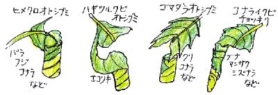 葉脈でぶら下がって揺りかご状態のものもあれば,葉の端っこへ揺りかごを作るものあり,さらにぐちゃぐちゃっと綴じておしまいものまである。そして,名前の由来のように,巻物を仕上げにスッパリ切断して,地面に落下させる「落とし文」状態のものもある。