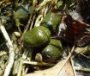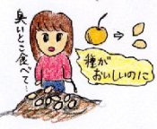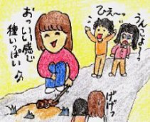 祖母の畑に隣接するのは父の知人の土地で,数々の苗木を植えているのが林となっている。既に成長して鬱蒼としていて,夏ならば確実に蚊の大襲撃を受けそうな場所だ。だが,そんな所というものは往々にして見つけものの宝庫,実はワクワク・ドキドキだ。 「あったー? うーん,ないねぇ〜」 暖かな午後,早春の木漏れ日がちらちらして,ピンクの絨毯をマダラに輝かせる。 「あ,鳥の羽根があるよ!」 おお,これはアオバト! 何かに襲われたのかな? よしよし,次男でかしたぞ。 「巻きぐそー!」うーむ,なかなか芸術的な巻きっぷり。長男のフン眼もたいしたものだ。 だんだん本来の捜し物も忘れ,各自もくもくと地面散策を楽しんでいる様子を呈してきた。 「母さん,ウンコがいっぱいあるよー」 長男が叫んでいる。またまた巻きものかな? サザンカのピンクの絨毯の中を足早に駆け抜け,長男の目線をたどってみると,その先には小高い山がいくつか見えた。「おーー! これってタヌキの溜めフンじゃない!」 溜めフン,それは獣のトイレである。 ケモノには,それぞれフンの仕方があって,キツネやテン・イタチなどは獣道沿いに目だつようにぽとんぽとんと落としてマーキング代わり・なわばりを主張している。 それに対して場所を決めてフンをするケモノがいる。 それも家族で使っているらしい。それは積み重なって山盛りだ。こんな状態のものを「溜めフン」といい,里山の動物ではタヌキやアナグマにその習性がある。実は,10年以上前に実家の倉庫辺りにもあったのだが,そうかこれがタヌキの溜めフンか・・・と気が付いたときには既に風化,捨てトイレになっていた。その悔しい思い出のリベンジもかねて,ちょっとおトイレ拝見といきましょう! フンの山を覗いてみたけれど… まず,フン観察必需品の棒を辺りで見繕う。 相手はフンである。どんな病気や虫が潜んでいるかわからない。さすがに私も素手で触るようなことはまずしない。使う棒は何でも良いと言うわけでなく,短いと手に付くし長いと思ったようにいじくれない。ちょっと硬度も必要だ。ただの棒に見えて選択は慎重だ。 これぞと言う棒を使ってフンの山を観察してみる。 当然のごとく,下になっている部分は古くて形が崩れ気味,新鮮そうな柔らかい物が頂点に来る。フン山は4つほどあり,その山はそれぞれ特徴があって,一つは銀杏の種 が多数入っている。それからお隣の山にはセンダンのシワシワの実がそのまま沢山だ。山の状態を見ると,銀杏の山の後,センダンの山が出来たらしい。さて,棒でほじっていると内容物が出てくる。 フンを水に溶かして内容物を調べるという方法をたまに目にするが,それによると,季節の食べ物のかす 虫,種の他に,人工物が出てくることが問題になっている。 輪ゴムやソーセージの留め金やビニールは混じっているかな? このタヌキの溜めフンを棒でいじってみた限りでは,人工物は見えないし沢山の内容物は見えないな〜という感じがする。 ふーーん,今の季節って解るのはこんなものぐらいなのかー。 ふと時計を見ると帰宅しなくてはいけない時間が迫っていた。 慌ててつついてほじったところ整形し,出来るだけ元通りにして,溜めフンを後にすることにした。 帰り道 「あー,こんなところでマヨネーーズのかすかじってる」 ぐちゃぐちゃ噛んだ後の空きかすが転がっている。お,これは人工物といえる。なくなった部分は食べたのかな? 気になるなぁ・・・。