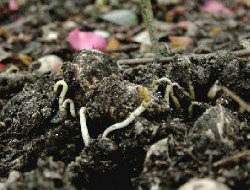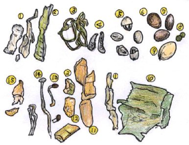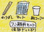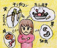 (平成14年 4月12日UP) そして2日後の溜めフン 気になる。 どうしても気になる。 あの溜めフンの中に,種以外の物があるんじゃないかな,消化不良になる変な物は拾って食べてないだろうか。 うーん,溜めフンが呼んでいる様な気がする。居ても立ってもいられず,一日オフの日を見繕って再び出かけた。 溜めフンとの対面も2度目なら,さらに一歩進んでフン解析をしてみようじゃないか。今回はマイ割り箸持参,水で溶く作業をするをするための紙コップ,ほぐした内容物を漉すための排水溝ネット,フンで汚れた道具を持って帰るのに厳重密封のためのナイロン袋等々,必須アイテムも袋に詰めて用意万端だ。さて,見慣れたサザンカの絨毯をフワリと踏みしめて一目散,溜めフンの場所に行ってみる。 この間,大事なタヌキのトイレをいじくったので,タヌキが嫌がって来なくなっていたらどうしよう。ドキドキしながら近づいてみると,心配ご無用,さらにフンの山は高くなっていた! さすが獣ヘンに里とかいて狸(タヌキ),人の匂いが怖くて暮らしてられるかという感じである。 ではさっそく拝見ー。 んっと息を止めて…ぐっと近づいて…目を凝らして…獣目線で近づくいてみて驚いた。白いものがニョキニョキ生えている! まるでモヤシ。季節は移り変わり,タヌキの溜フンにも春が来ているのだなぁ。植物の種散布大作戦は大成功。生き物のつながりってとてもうまくできているなぁと,妙に感心してしまう。でもまてよ…この様子だと一昨日もあったはず。ただ「こんなものかな〜」とぼーんやり眺めていた一昨日の目は節穴だった。 見つけものというものは「見てみよう」という心がけ次第で,何倍にも面白いものが見つかるものなのだ。 しばらくその「見てみよう」視線で,棒を使ってゴソゴソしていたが,解るものといえばやはり銀杏の種とセンダンの実ばかり。あとは固そうな物体の一まとまりという感じがする。というわけで,必須アイテム,フン解析セットの出番がきたようだ。 どれにしようかな・・・よりどりみどり,どのフンでも良いのだが,出来るだけ怪しそうな物が詰まっていそうなフンを選ぶ。なにやら宝探しの雰囲気。選ぶのも真剣そのものである。おめがねにかなった4塊のフンを,用意していた紙コップに入れて祖母の家の庭に持って帰る。そして水でほぐしてみるのだ。 以前謎の毛だらけフンは随分難航したので覚悟をしていたが,水攻めの前に固いフンもあっけなく総崩れ,よしよし,この調子。水を丹念に換えていこう。 ![]() 佳境に入ったところで,突然セールスマンに声を掛けられたり,隣人の方がベランダから見られている気配を感じたりするものだから,なかなかスリルがあってドキドキする。まさかフンコップを持っているなんて思いもしないのにギクッとしてしまう。まったくフン愛好家の肩身というのは狭いものである。 糞というものはくさい。だけれど,溶かしているとその糞臭い匂いとは違う独特の匂いがする。何のこれしきと思うものの,臭いものに蓋というわけいかないのでぐっと異臭をこらえる。こんなとき鼻が利く体質は困りものだ。 フンの中身は? 幾度か水を換えつつほぐしているとー内容物が出てくる出てくる。目で見て解らなかったものがゾクゾク露出してきた。