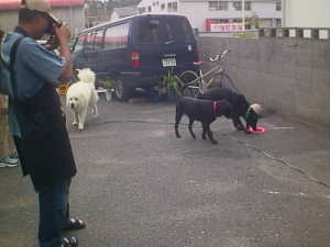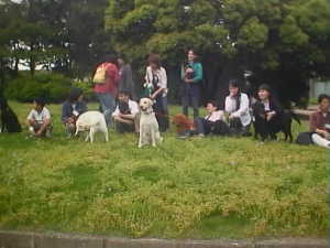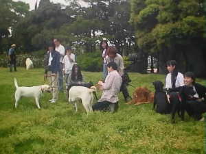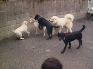 | ジョリィ君(左)も仲間に入りたい | 色白ラブと真っ黒ラブ入り乱れ | 犬が苦手なプリンちゃん | 若い子についていけないガルボ | |||
