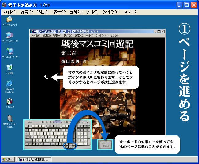 青空文庫はボランテイアで運営され著作権の切れた書物のデジタル化が行われているサイトから エキスパンドブック という書式をダウンロードすると読書感覚でページめくりが出来る(ワンクリックでページめくり)