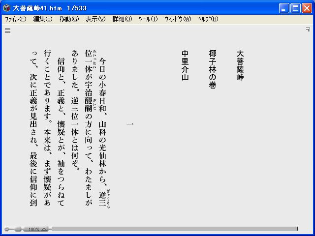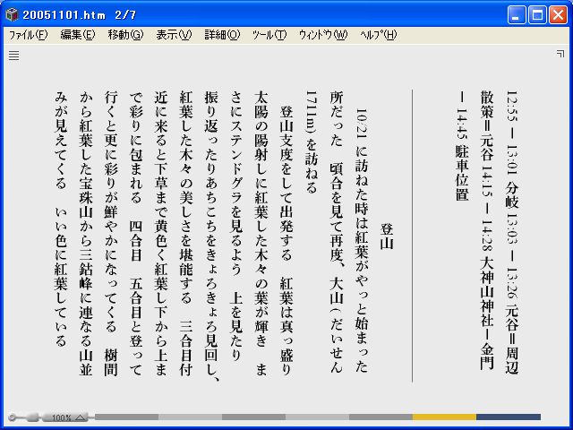 T-Timeの説明はこちらソフトをダウンロードして起動すると下記のようにマニュアルが表示される ファイル開くで保存してある大菩薩峠41巻(大菩薩峠41.htm)を開くと下記のように表示してくれる htm形式のままだと下記のとおり 私のホームページの登山日記も下記のように展開してくれる