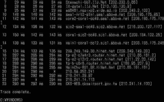 Dosプロンプトで tracert を調べたところ 最初の数回は 下記のメッセージが出て