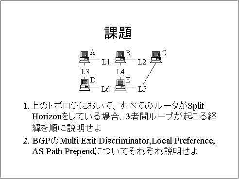 課題1L1、と L3 のリンクが切れた場合 Cが持つ経路情報により3者間ループが生じる