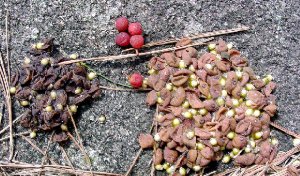 石の上に 種と実の殻が2盛り! 正真正銘 何かのフン。 色が違うのは,NewとOldかな?