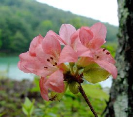 初夏を思わせる暑い日差し。 汗をかきかき遊歩道へ入ったとたん… おおー ひ〜んやり ああー なんて林は木陰って涼しいの! 半年ぶりに訪れたこの道で どんなものに出会えるかな… 暗い林で フ〜ンワリ光る ![]() 出迎えてくれた ガマズミの仲間。 わぁ,きれい♪ 赤いツツジが 緑の中でパ〜ッと色を添えます。