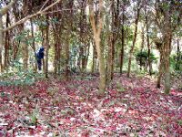 祖母の畑に隣接するのは父の知人の土地で,数々の苗木を植えているのが林となっている。既に成長して鬱蒼としていて,夏ならば確実に蚊の大襲撃を受けそうな場所だ。だが,そんな所というものは往々にして見つけものの宝庫,実はワクワク・ドキドキだ。 「あったー? うーん,ないねぇ〜」 暖かな午後,早春の木漏れ日がちらちらして,ピンクの絨毯をマダラに輝かせる。 「あ,鳥の羽根があるよ!」 おお,これはアオバト! 何かに襲われたのかな? よしよし,次男でかしたぞ。 「巻きぐそー!」うーむ,なかなか芸術的な巻きっぷり。長男のフン眼もたいしたものだ。 だんだん本来の捜し物も忘れ,各自もくもくと地面散策を楽しんでいる様子を呈してきた。 「母さん,ウンコがいっぱいあるよー」 長男が叫んでいる。またまた巻きものかな? サザンカのピンクの絨毯の中を足早に駆け抜け,長男の目線をたどってみると,その先には小高い山がいくつか見えた。「おーー! これってタヌキの溜めフンじゃない!」 溜めフン,それは獣のトイレである。 ケモノには,それぞれフンの仕方があって,キツネやテン・イタチなどは獣道沿いに目だつようにぽとんぽとんと落としてマーキング代わり・なわばりを主張している。 それに対して場所を決めてフンをするケモノがいる。 それも家族で使っているらしい。それは積み重なって山盛りだ。こんな状態のものを「溜めフン」といい,里山の動物ではタヌキやアナグマにその習性がある。実は,10年以上前に実家の倉庫辺りにもあったのだが,そうかこれがタヌキの溜めフンか・・・と気が付いたときには既に風化,捨てトイレになっていた。その悔しい思い出のリベンジもかねて,ちょっとおトイレ拝見といきましょう! フンの山を覗いてみたけれど… まず,フン観察必需品の棒を辺りで見繕う。 相手はフンである。どんな病気や虫が潜んでいるかわからない。さすがに私も素手で触るようなことはまずしない。使う棒は何でも良いと言うわけでなく,短いと手に付くし長いと思ったようにいじくれない。ちょっと硬度も必要だ。ただの棒に見えて選択は慎重だ。 これぞと言う棒を使ってフンの山を観察してみる。 当然のごとく,下になっている部分は古くて形が崩れ気味,新鮮そうな柔らかい物が頂点に来る。フン山は4つほどあり,その山はそれぞれ特徴があって,一つは銀杏の種 が多数入っている。それからお隣の山にはセンダンのシワシワの実がそのまま沢山だ。山の状態を見ると,銀杏の山の後,センダンの山が出来たらしい。さて,棒でほじっていると内容物が出てくる。 フンを水に溶かして内容物を調べるという方法をたまに目にするが,それによると,季節の食べ物のかす 虫,種の他に,人工物が出てくることが問題になっている。 輪ゴムやソーセージの留め金やビニールは混じっているかな? このタヌキの溜めフンを棒でいじってみた限りでは,人工物は見えないし沢山の内容物は見えないな〜という感じがする。 ふーーん,今の季節って解るのはこんなものぐらいなのかー。 ふと時計を見ると帰宅しなくてはいけない時間が迫っていた。 慌ててつついてほじったところ整形し,出来るだけ元通りにして,溜めフンを後にすることにした。 帰り道 「あー,こんなところでマヨネーーズのかすかじってる」 ぐちゃぐちゃ噛んだ後の空きかすが転がっている。お,これは人工物といえる。なくなった部分は食べたのかな? 気になるなぁ・・・。