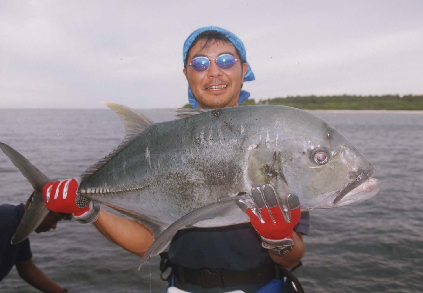 4日目は、凄いものを見れた。今日は、移動が長いためポイントをかなり絞って攻めて行く。アウトリーフを攻めながら快調に釣れていた。ルアーを赤い色の魚(バラフエダイ)やGT取り合いで襲い掛かってくる。見ているだけで楽しいと言うか、恐ろしい光景だった。事件はそんな中起こった。何時ものように会長のルアーに魚が襲い掛かった。見ていた瞬間GTではなくバラフエダイだと思ったいながら、ビデオを取りに行った。会長のところまで戻ると、フルドラグにしてある、リールから物凄い勢いでラインが出て行っている。これはバラフエダイではなくGTだ。しかもかなりの大きさのよう。しかし会長のファイトは至って落ち着いている。さすがである。6分ぐらいの格闘で上がってきたGTは、見た事のない巨大GT。まさに畳一条の言葉がぴったりぐらいの大きさだった。これには、ビスタ1のキャプテンも大喜び!自分もビデオを撮りながら鳥肌が立ってきた。こんなサイズが見れて最高に幸せだった。会長、有難うございました。