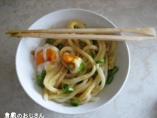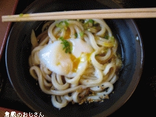 国道377号を高松空港方向に向かい東へ約2km走り県道17号を北に「山越うどん」から約7kmで「田村」に10時40分に到着する。今日は早3軒目のうどん屋さんだ。店の前の駐車場で先ほど「山越うどん」で食べていたグループが記念写真を撮っている。自動車は早いが何件目のうどんだろうか?前の2軒に比べ店は空いていて大将に温かいか冷たいかを言い、うどんを貰って釜で温め醤油を掛け保冷庫の中の温泉卵戴き席に付いて「醤油うどん(小)」に温泉卵を絡めて食べる。これ又、腰の強い味わいの有るうどんだ。 |