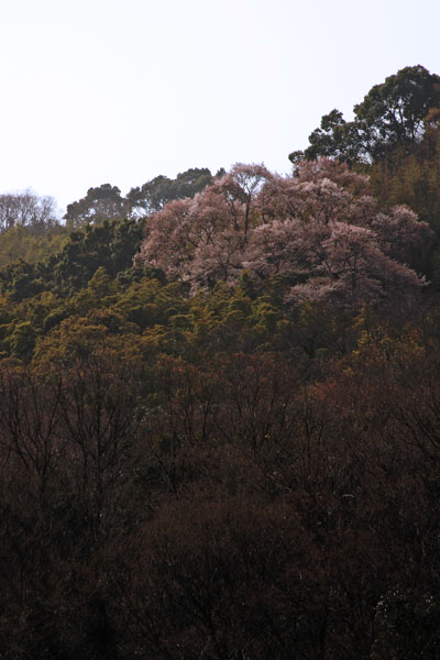 | 駐車場はあまり停めれません。バイクのためすんなり駐車。桜は山の上部に見えております。 ほんの少しの距離です。雑木林の中に約250Mロープが張ってあり、無料の杖を用意してくれてます。 最大斜度は30度を超えている様子。粘土質の土。久々の運動(きつ過ぎ)の後、視界が開け 「大山桜」・・・なんと逆光!裏技により一枚だけ撮影。 斜面にヤマタノオロチのごとく存在しております。 |
