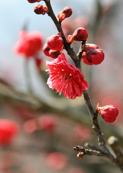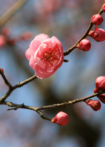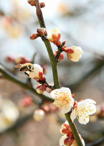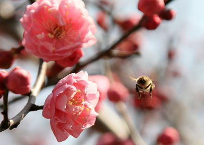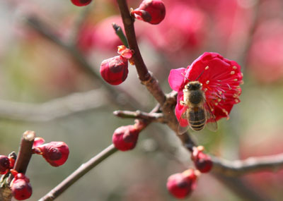 ![]() ピンクの梅は今日の温度が高かったせいか、 2時間ほどのうちに音を発てて咲いていました。 音は蜂の羽音でした。ミツバチと平田アブが 飛び回っていました。 |