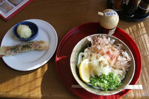 おろししょうゆうどん 350円 相方はふくちゃんスペシャル 580円 さあ、生醤油をかけてかき混ぜ、・・・・