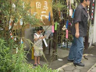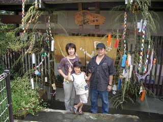 店の前に七夕飾りが飾ってました。せいやくんが書き込んで竹に結んでました。画像をクリックして見て。