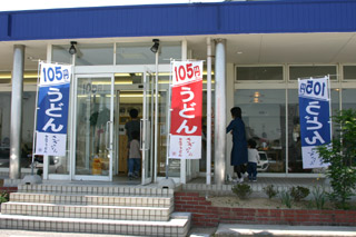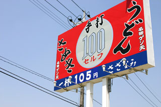 消費税が内税表示のため、105円うどんの表示。100円うどんの方がネーミングが良いですね。看板の中は100円玉。