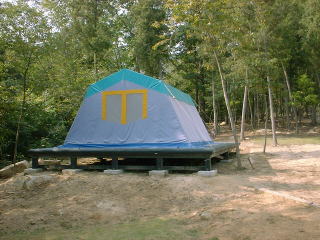 林間サイトの中に2つの常設テントがありました。常設テントといえば、長い間、風雨にさらされており、きれいなイメージがありませんが、左の写真を撮影した時点はまだ新しく感じました。