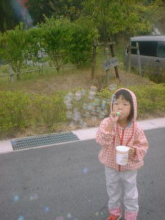 その後、シャボン玉遊び。湿度が高いせいか、シャボン玉が割れません。地面についても割れずにそのまま。シャボン玉マジックの状態に、大興奮で遊んでいました。