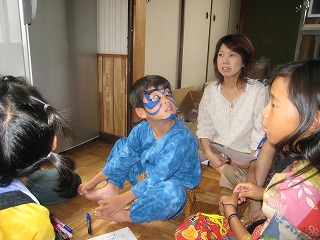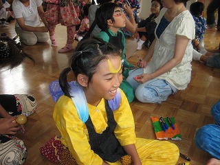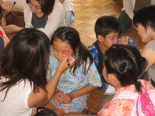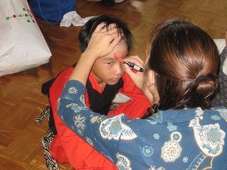 出発前の準備の様子です。 フェイスペイントを使って、顔に模様を付けていきます。