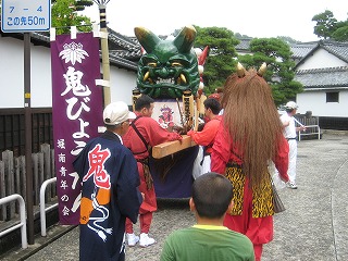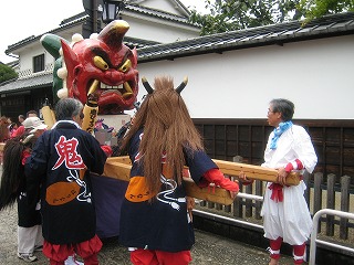 美観地区の入り口に、鬼神輿を据え付けて、ここを拠点に練り歩きの準備をします。