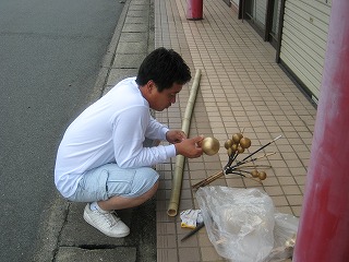 のぼりを取り付ける竹に金色に塗ったひょうたんを取り付けて行きます。