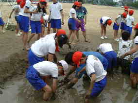 ここの学校のびっくりする所は、なんと、学校のグラウンドを深く掘って、レンコン田を作ってしまったところです。