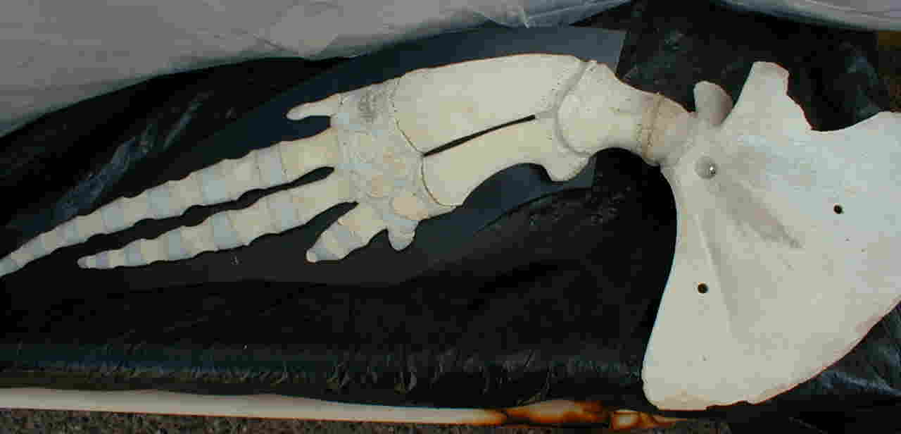 「むなびれ」は、おおむかし、イルカがりくにいたころ、うでだったぶぶんの なごりだそうです。 ほねのもけいですが、ちゃんと にんげんのゆびのように、5ほん、ほねがあるのには、かんどうです。