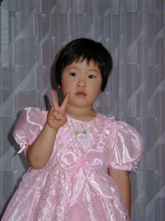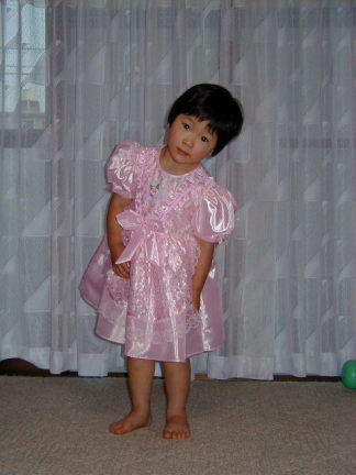 どうした事だ!一体どうしたんだ!と驚くほどでもないのですが、、、馬子にも衣装とはよく言ったものです。春奈が結婚式に呼ばれてフラワーガールをやってくれと言うお呼びがかかったのです。私のいとこ(私はよく知りませんが(笑))の結婚式でじいちゃんとばあちゃんが呼ばれていてどうしてもと言うことで承諾したそうです。その日から孫の手を花束に見立ててフラワーガールの特訓です。始めは意味がよくわかってないようでなかなか苦労したそうです。この日は私がネットオークションでGETしたドレスを着て最終確認です。本人もドレスを着ると人が変わったようにおとなしくなりました。ちょっとうれしそうです。