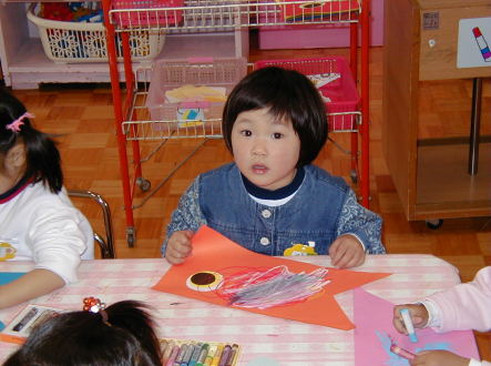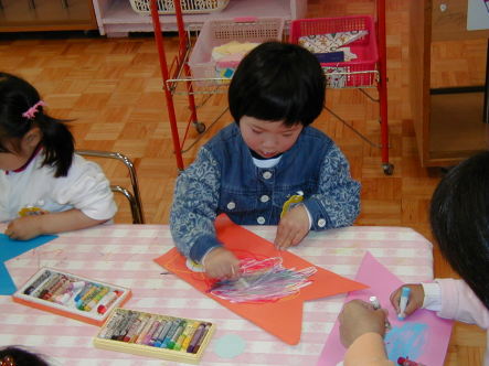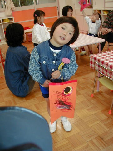 春奈も幼稚園に通い始めて約3週間。(といっても、週3日の通園だが)だんだん幼稚園にも慣れてきた。親が一緒についていかなければならないのはちょっとつらいが。この日はこいのぼりつくりをやった。先生があらかじめ作っておいたこいのぼりにクレヨンでぬりぬり。お世辞にも上手とはいえないが、楽しそうである。