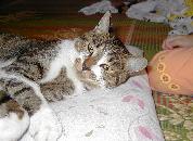 1999年の11月に近くの公園にてままが主人の承諾も得ず拾ってきて、いきなり家族の一員となる。が、2000年の7月にフーテンのトラさんがごとくふらっと旅に出て行方不明になる。9月13日に旅に疲れたのかふらっと帰ってきた。見た目どうりただの雑種のねこであるがねこのくせに恩は忘れていないようだ。このまま居つくのか、放浪のくせがぬけずまた旅に出るのかはわからないが、今のところ居心地がいいのか居ついている。不思議なねこだ。 (2001年7月よりまたまた放浪のたびへ出かけ行方不明中) |