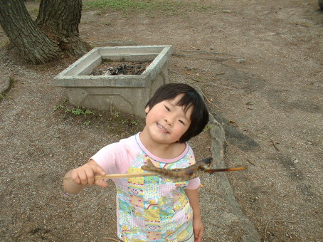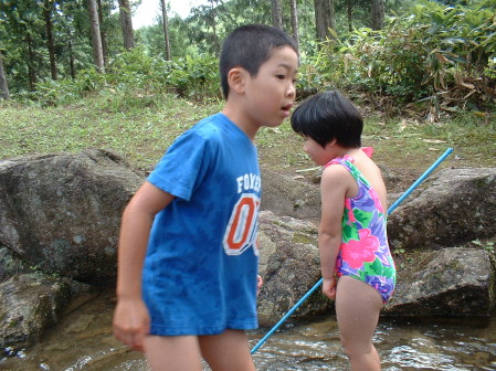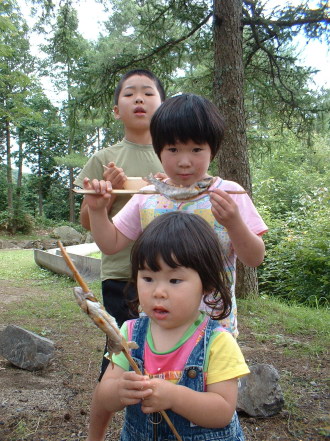 2日目の昼食はひらめ(あまご)の塩焼きです。その前につかみ取りをして昼食をGETしてもらいます。 |