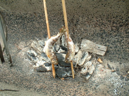 取れたひらめ(あまご)を串にさして炭火で焼きます。 |