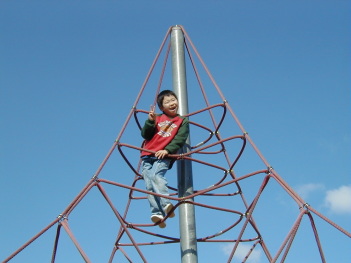小さいころには怖がって登らなかったロープのジャングルジム。 もうこんなところまで登れるようになりました。 |