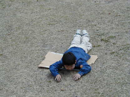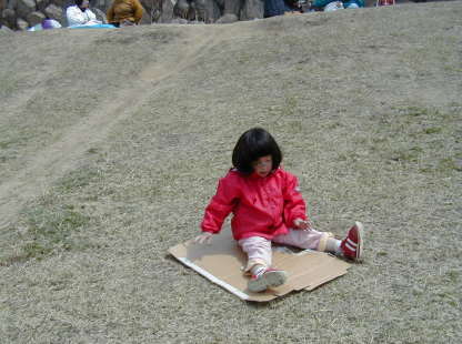 ![]() 早速芝生の斜面にてそり遊び。近くに捨ててあったダンボールを使って。 |