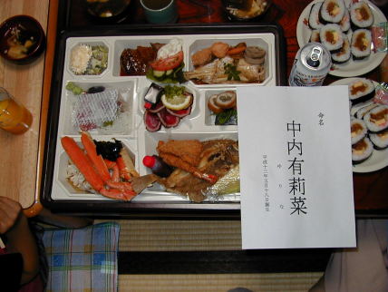 | 有莉菜の名付けのお祝いに奮発してお膳をとりました。当然有莉菜にも、、、といいたいところですが形だけであとはお父さんのおなかの中に。 |