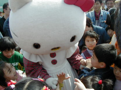この日はハローキティのイベントがあってみんなにもみくちゃにされてました。かろうじてあっくんが握手できました。中に入っている人も大変だ。 |