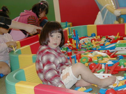 ダイヤブロックの館で自由にブロック遊びが出来ます。春奈も楽しそうです。 (顔は疲れてますけど) |