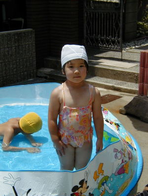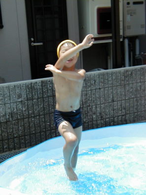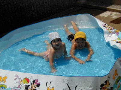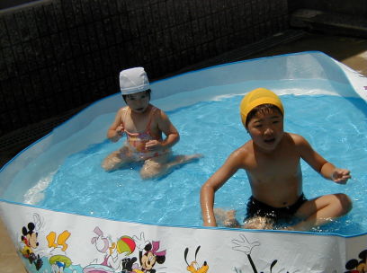 この日も朝からさんさんと照りつける太陽。梅雨だというのにこの天気。本当にうんざりする。本格的な夏はこれからだというのに。子供たちも朝からばて気味どころかまとわりついてくる。ということで子供たちをだまらすにはプールが一番。この夏はちょっときばって大きいプールにしようと思い、買ってきたのが下のプールである。思ったより水が大量にいる。(500Lぐらいかなあ?)水道代が心配だ。