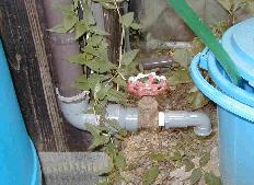 左のような雨水タンク(270L)に雨水を貯めるようにあまどいからのパイプにいろんなものを接続して貯めるようにしました。