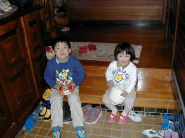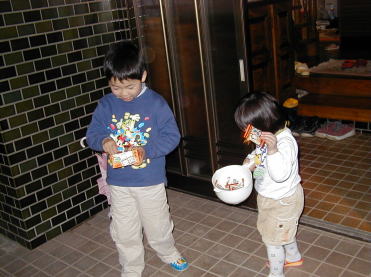 2人して玄関先で豆まき。あとで親が豆を拾ってまわる。 こういうときも2人同じことをしないと気が済まない。 |