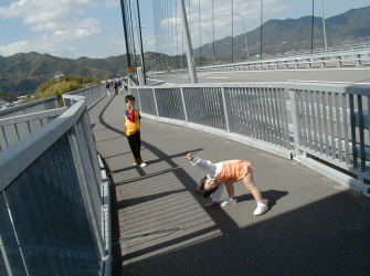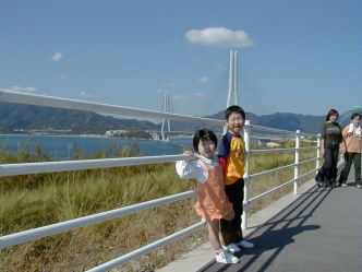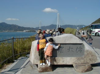ある秋の一日、会社の厚生行事で「しまなみ海道ウオーキング」という行事があり、私としてはしまなみ海道は因島までしか行ったことがないのでおまけにバスで連れて行ってくれるとくれば、もう行くしかないでしょうというわけで参加することになりました。しまなみ海道の橋のひとつ「多々良大橋」を歩いて渡るというのがこの行事の一大イベントでもあった。とはいえ我が家は6歳、3歳、0歳と3人の子供ずれになる。歩いた感想は?、、、、、、、「もういいです」という感じでした。