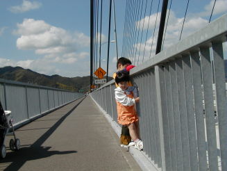 橋の半分を過ぎたあたり。まだ元気いっぱい。親はばてばて |