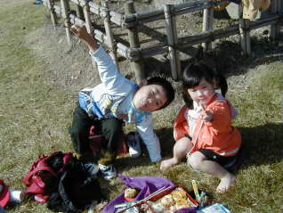 2人そろって仲良くお弁当。ろくに食べずにすぐにどこかへ遊びに行ってしまいました。