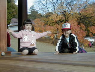 閑谷学校の講堂の廊下ではしゃぐ子供たち。 バックの木の紅葉がまことにきれいです。