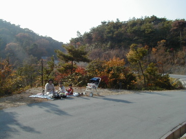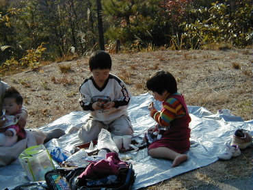 延々と舗装された道を2時間程度歩きました。でも空気は美味しいのでいい運動になりました。ふれあいの森は良くわからず結局こんな道端でお弁当となりました。 |
