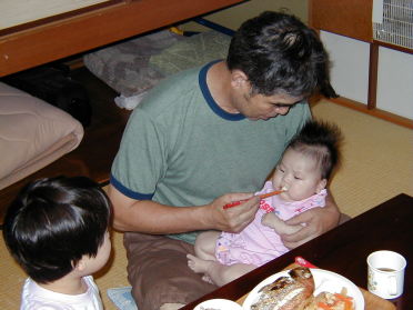 有莉菜が生まれておよそ100日。お食い初めの儀式(?)を行いました。こういう儀式は我が家ではお金をかけずに、形だけ、、、?一番長老(?)のじいちゃんがご飯をお口に持っていき食べさすふりで儀式完了。ゆりなも3ヶ月をすぎてますます元気にぶくぶく育っています。お兄ちゃんに似て頭が大きいのが???元気に大きく(?)育ちますように。