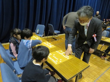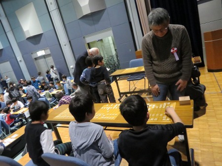 見学に来ていた児島の藤原存範先生にも急遽指導対局をお願いしました。 ほぼ全員指導対局を受けることができました。。 |